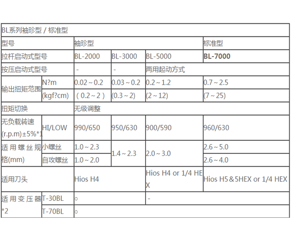 BL-7000,BL-5000,BL-2000,BL-3000,电动起子技术参数: